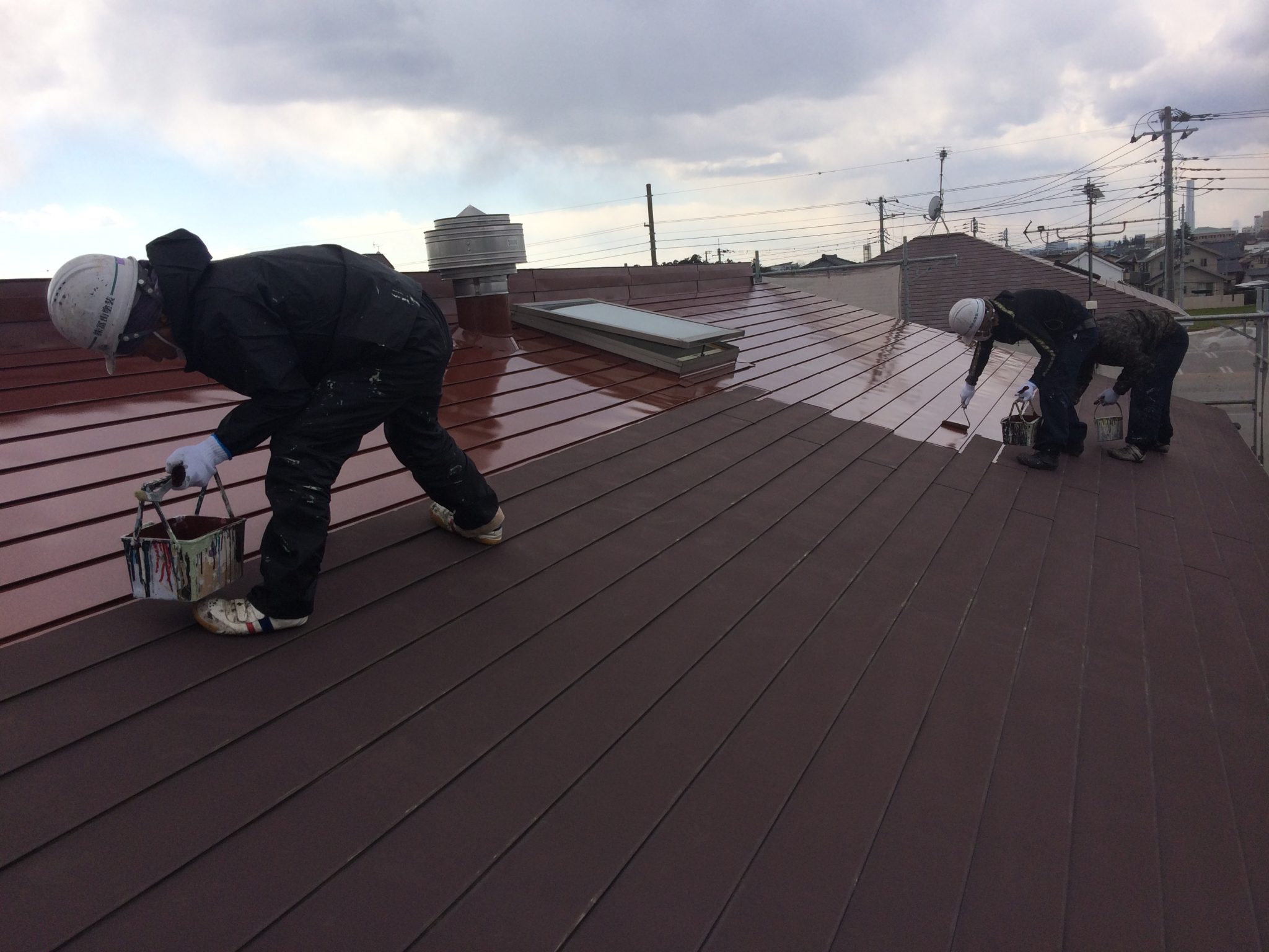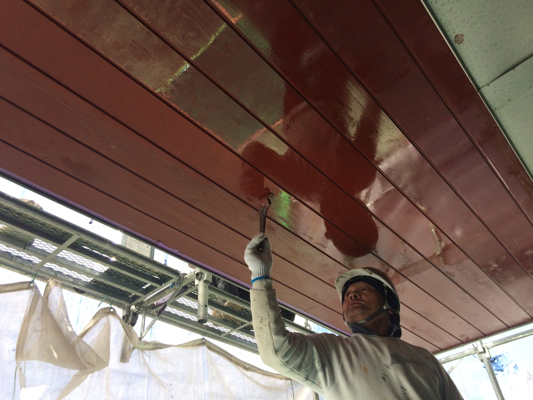 今日は朝イチ外壁下塗りを終わらせてから、屋根の下塗り、木部の塗装と手分けして作業しました(^-^)