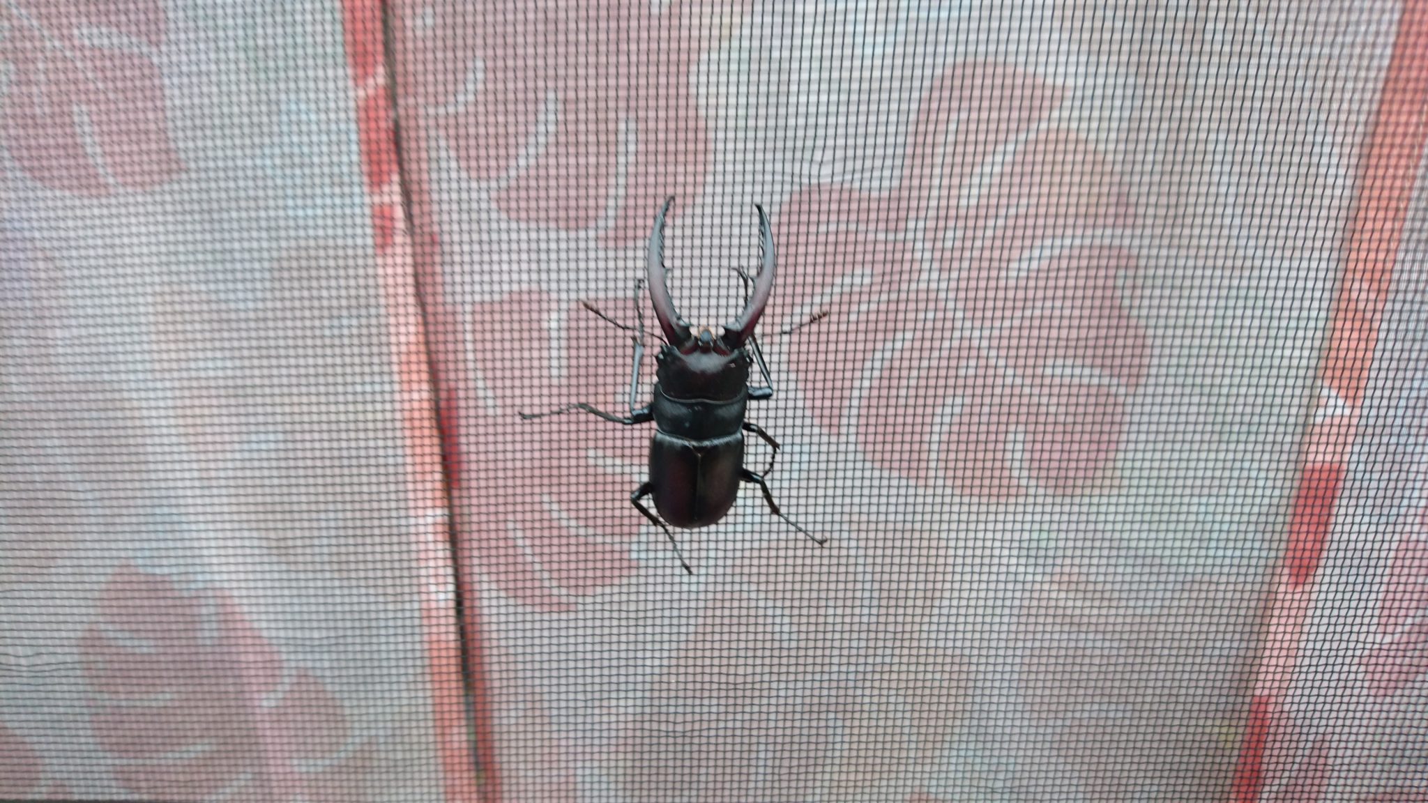 今朝雨戸をあけるとクワガタ虫が網戸に張り付いていました。