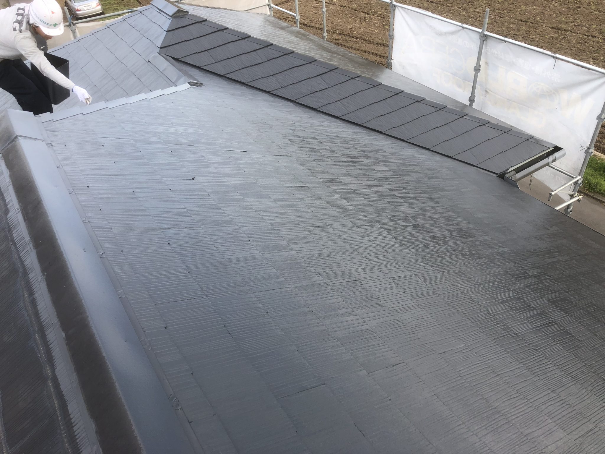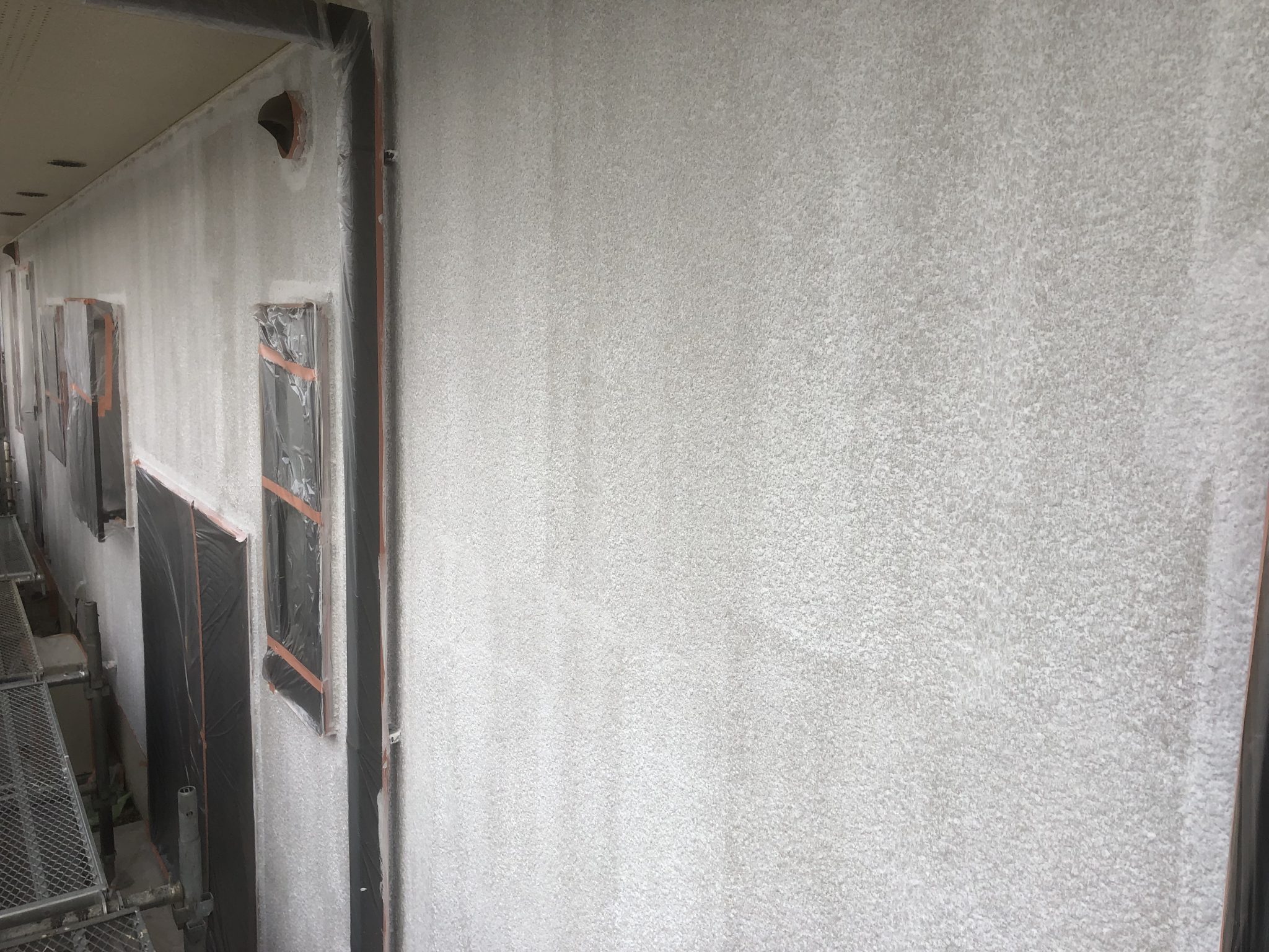 養生作業も終わり、外壁下塗り、二階大屋根の下塗りまで完了しました!