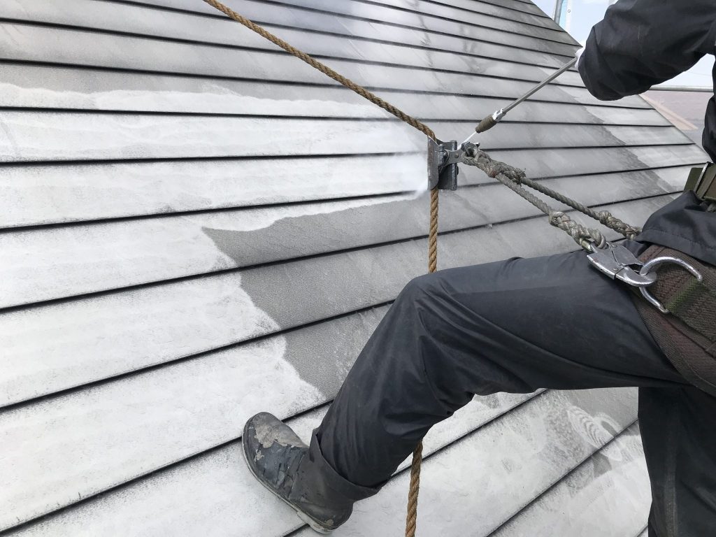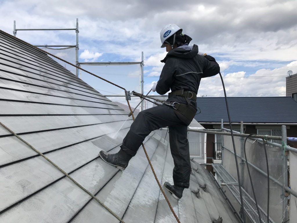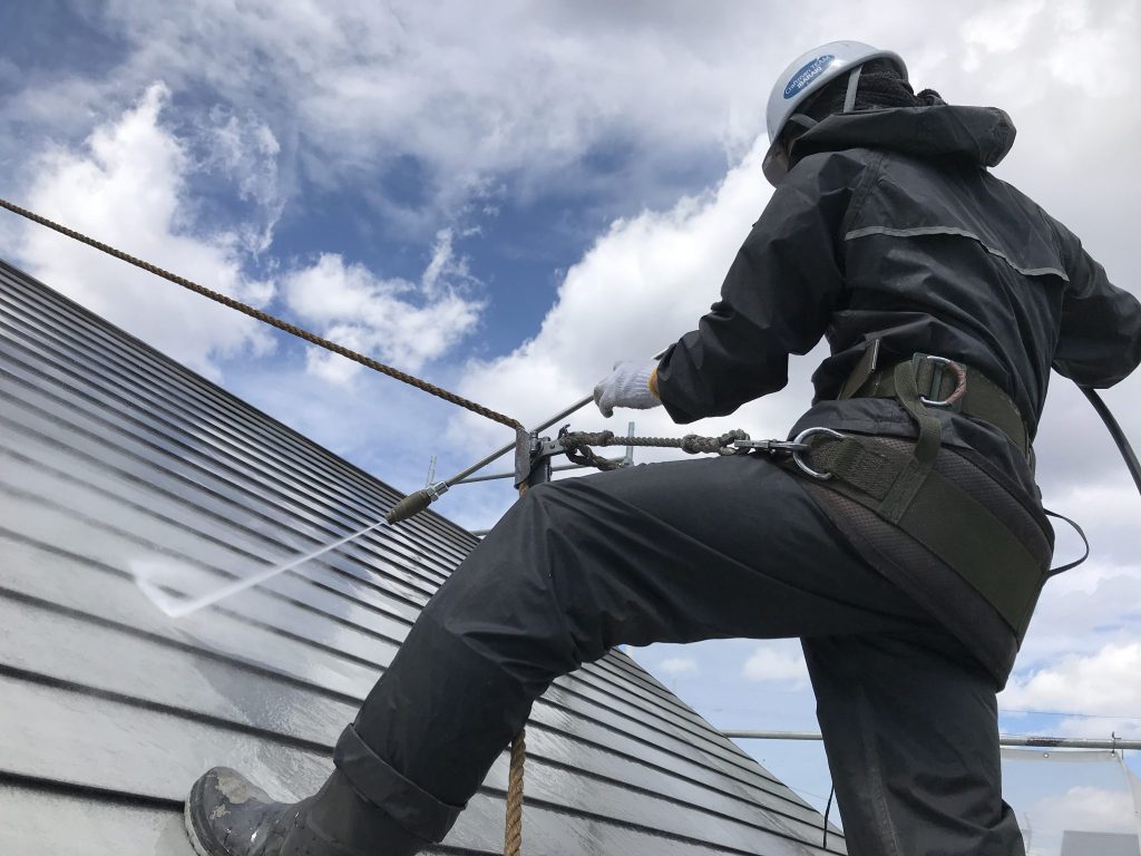 屋根勾配がちょっとキツイのですが安全帯を使用して確実に洗浄していきます。