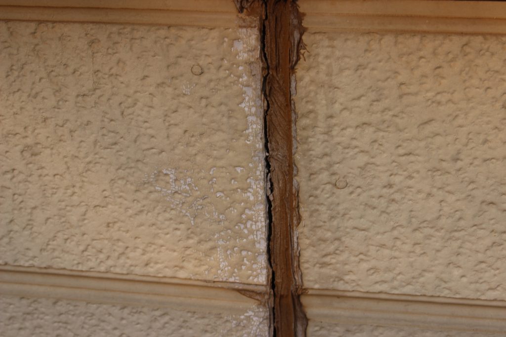 目地シーリングの割れについては、写真のように割れて隙間があったり、ゴム状のシーリング材が堅くなってしまったりすると、防水効果・地震などによる外壁への衝撃吸収効果が無くなってしまいますので、打ち替えをお勧めしています。