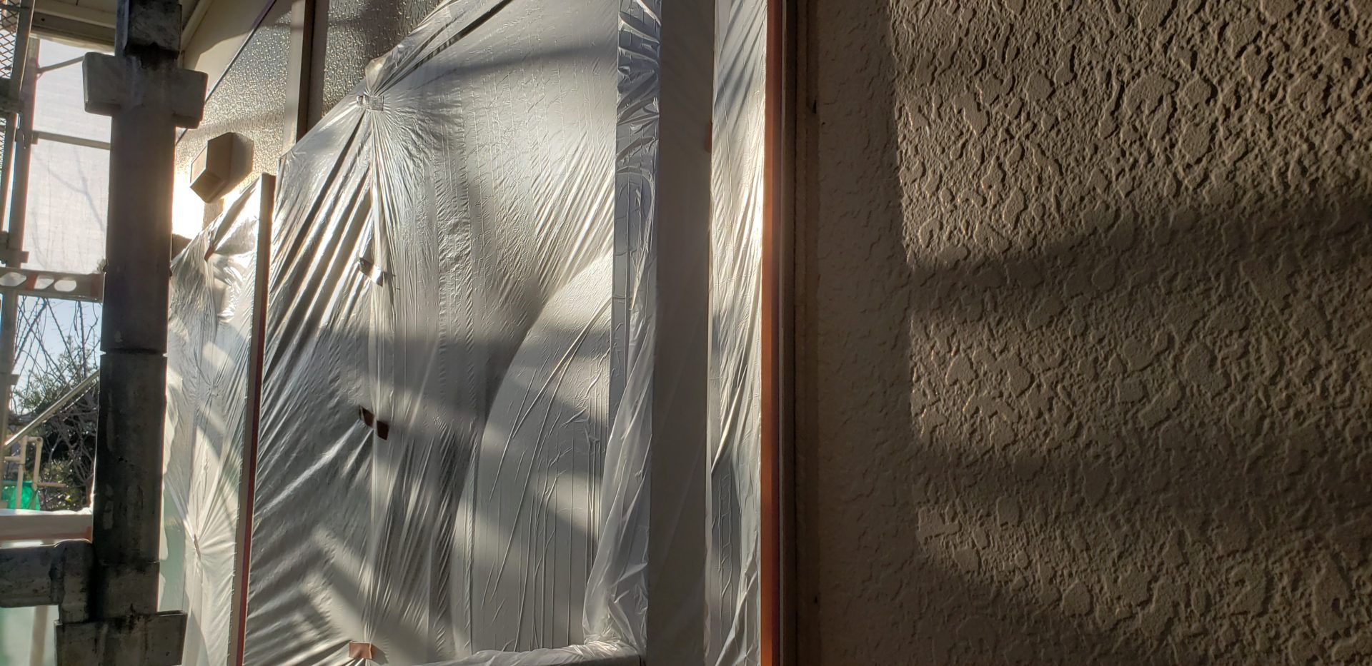 写真の部屋は空き部屋なので全面塞いでいますが、入居者のいる部屋は一部開閉できるように養生しています。