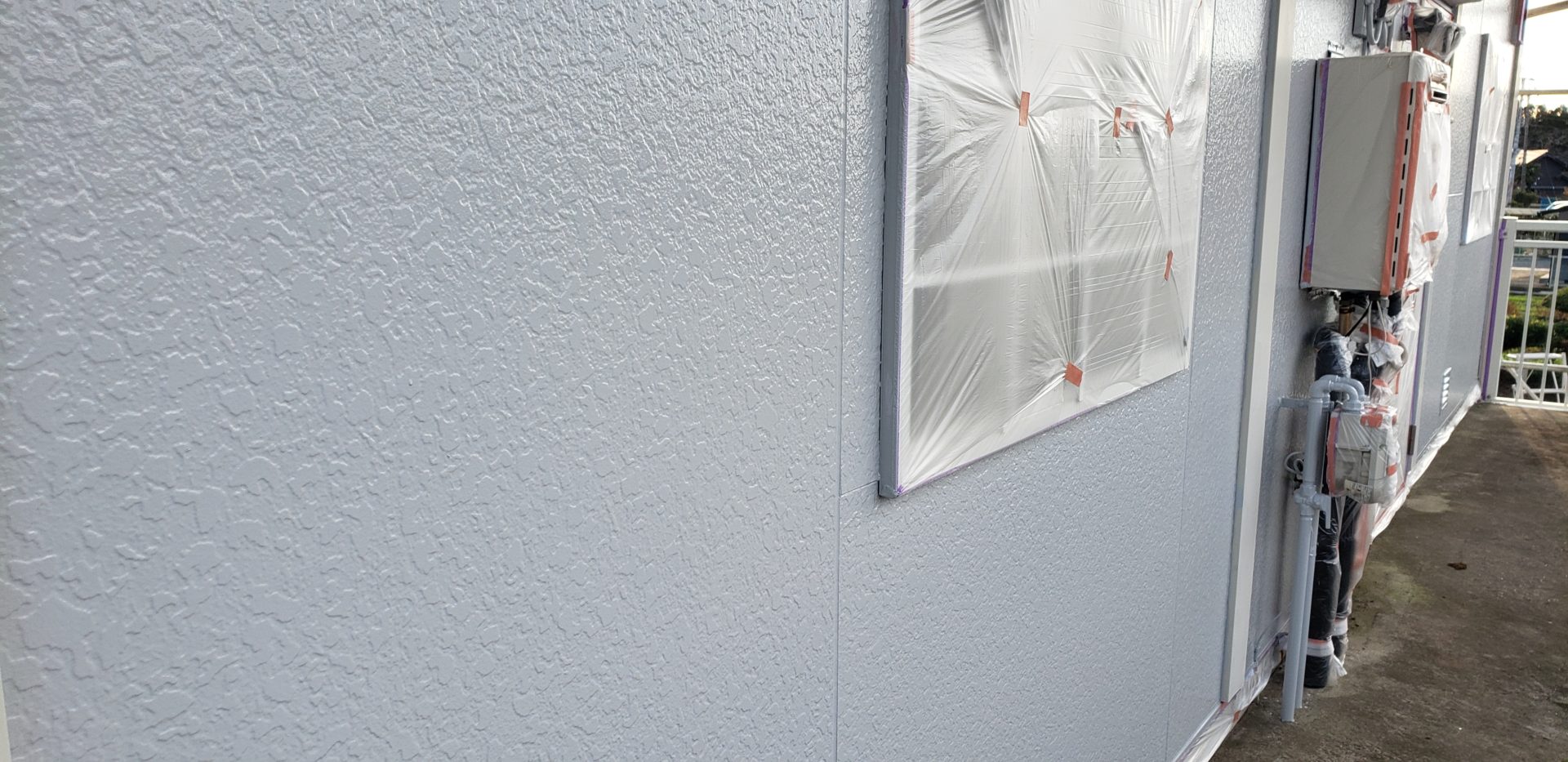 本日、ベランダ・玄関面の外壁が仕上がりました。