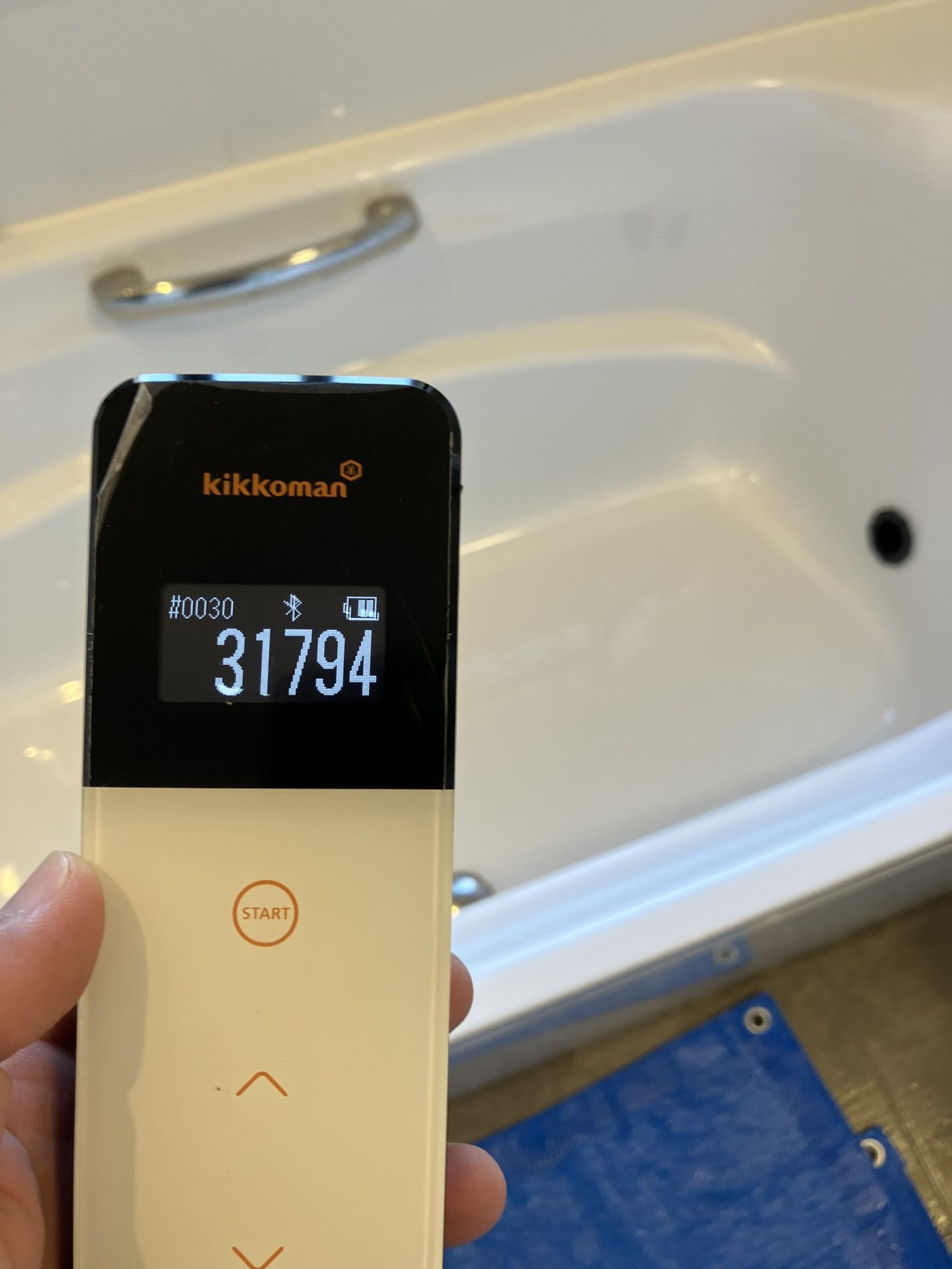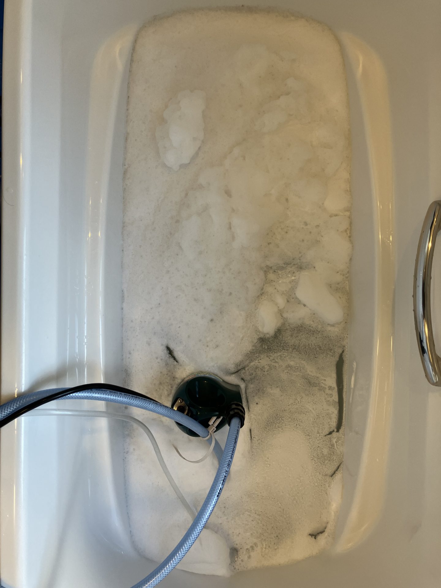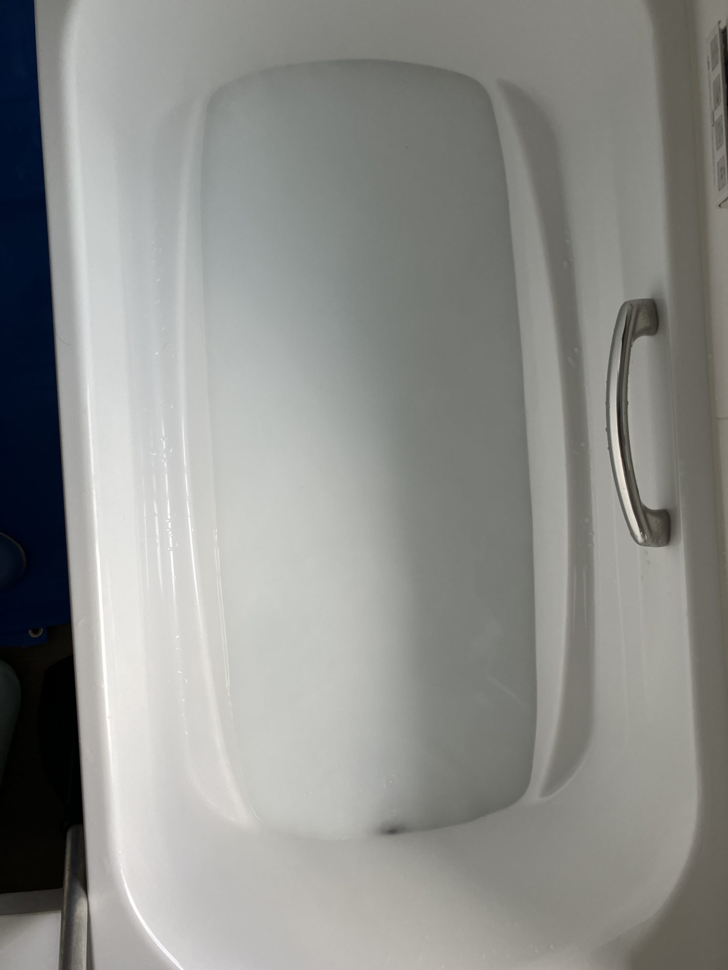 洗浄剤を投入➡撹拌を追い炊き機能を作動させながら繰り返します。ご覧のとおり白いお湯の状態でした。(汚れがひどい時はこの時点で汚れが出ることもあります。)
