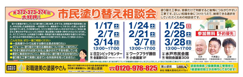 冨山塗装では、地域の皆様が安心して塗り替え工事を検討できるよう、『市民塗り替え相談会・無料』を開催しています。